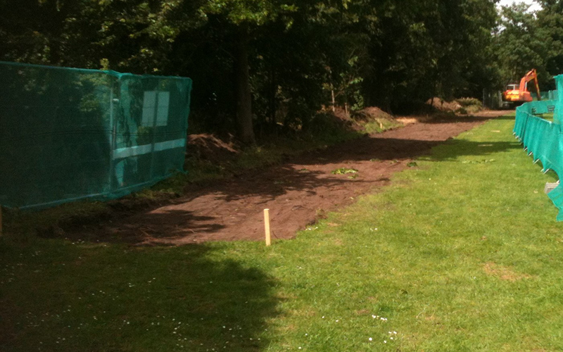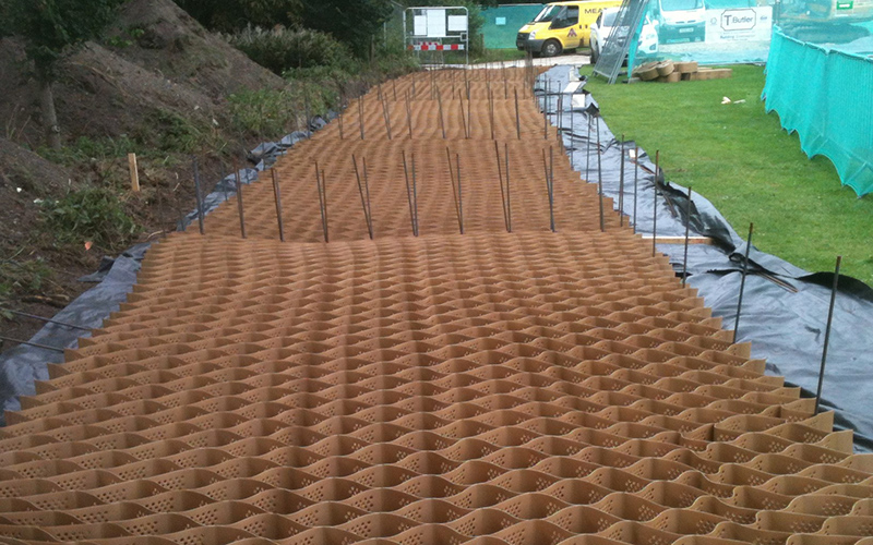 Due to the proximity of trees a cellular grid was required to offer protection to the nearby roots. Works commenced with the vegetation being stripped off down to a level formation. A terram membrane was laid before the webbing was laid out and pinned in place.